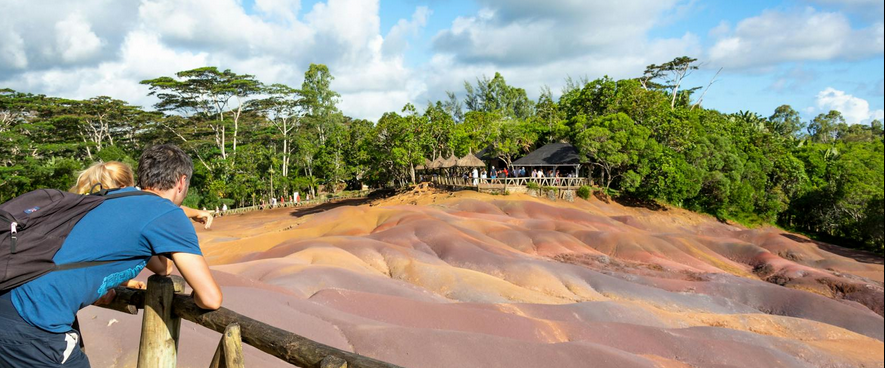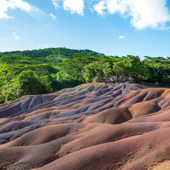 Die Siebenfarbige Erde befindet sich im Südwesten der Insel Mauritius in der Nähe des Ortes Chamarel. Die Erde leuchtet in sieben verschiedenen Farben: Rot, Braun, Gelb, Lila, Grün, Blau und Violett. Die Farben entstanden durch die Zersetzung von Vulkangestein über Millionen von Jahren. Durch die Verwitterung bilden sich mehrere Mineralien, die die Erde in verschiedenen Farben färbten. Die Farben sind so intensiv, dass sie auch nach Millionen von Jahren noch nicht verblasst sind.